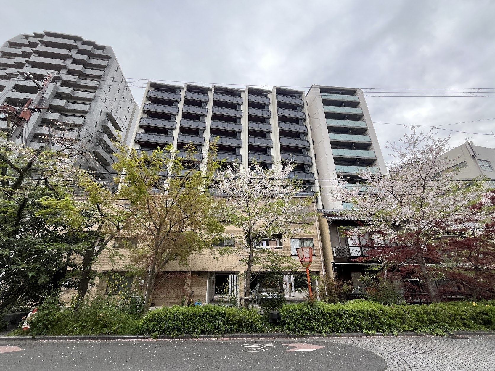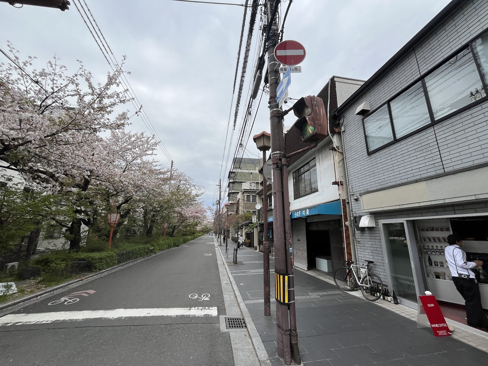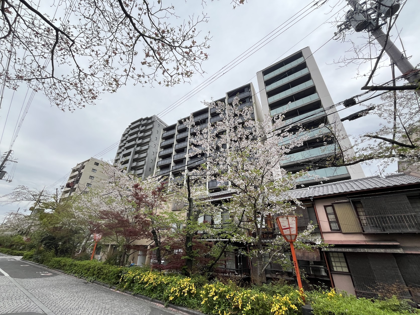 木屋町通には桜。東に眺望が抜けるここ最近分譲された「ザ・パークハウス京都河原町通」の上層階は高額でも売れるとそんな新聞記事を見た。
