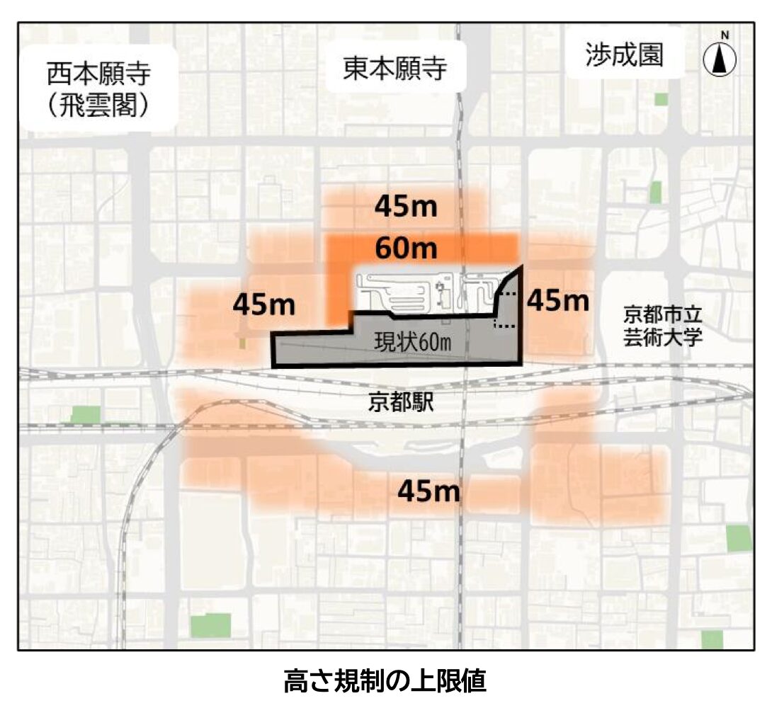 右側の京都駅ビルの高さ60mまで建築可能となります