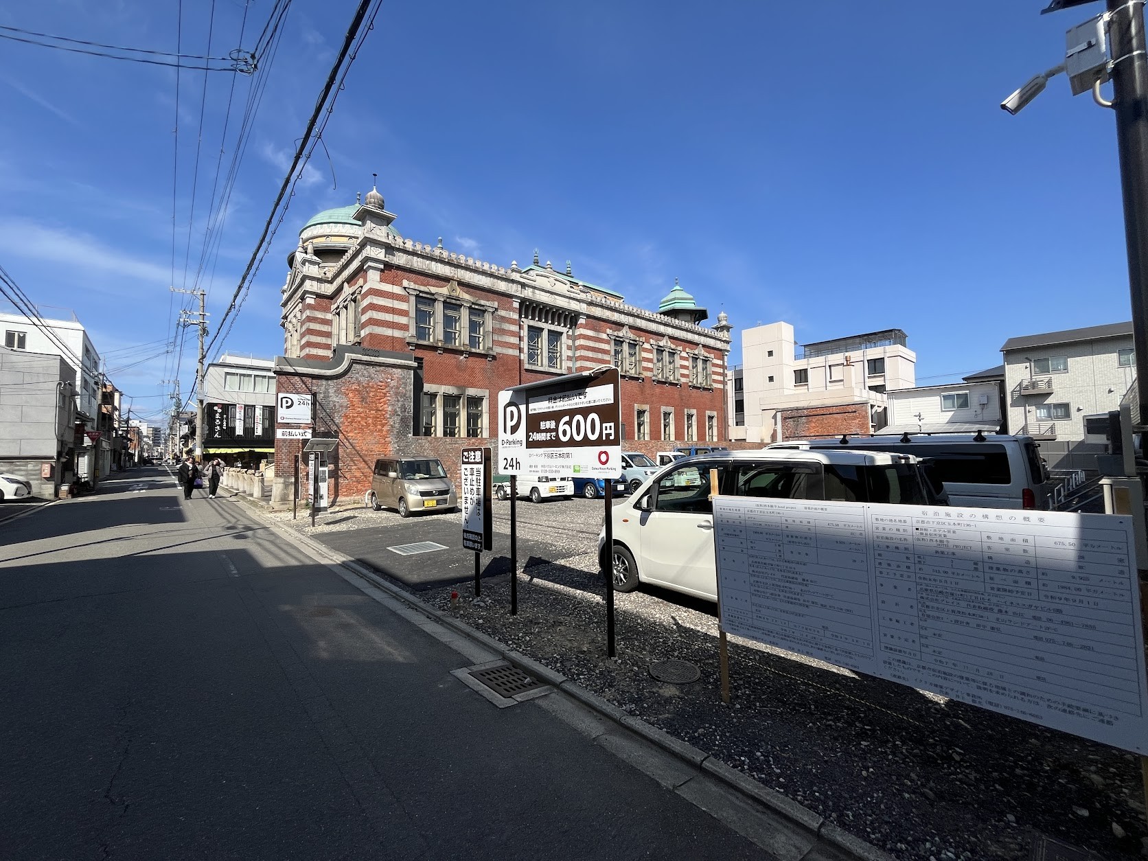 一際目立つ本願寺伝道院の南の砂利パーキングにはホテル計画(3階建・28室)の標識が設置されていました