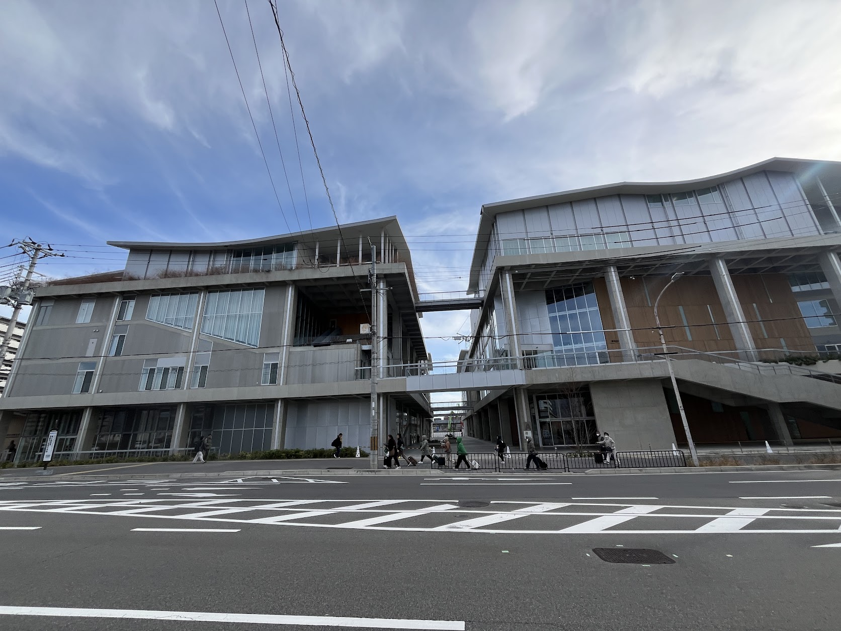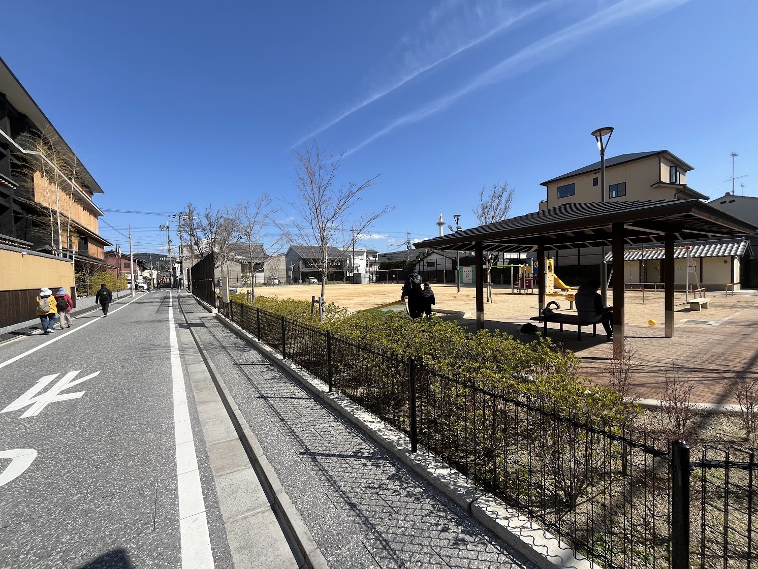スーツケースを引く訪日旅行者の団体が大学前を東へ歩きます。京都駅から東へ向かう動線が確実に生まれてきています。この校舎奥(南側)に隣接する土地には「共創HUB京都」が計画されています