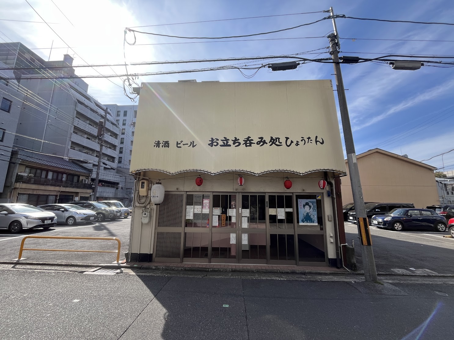 半年以上前から閉まったままの「立ち呑み処 ひょうたん」。まわりはパーキングで固められ、解体される日を待っているかのようなひっそりとした佇まいです