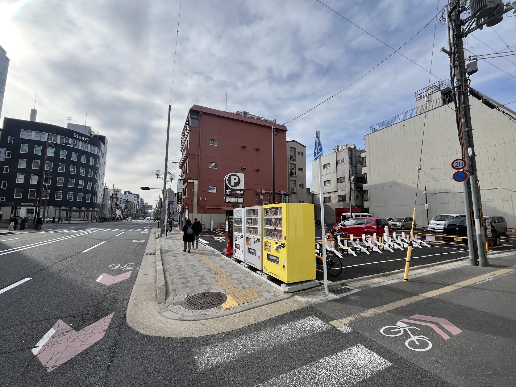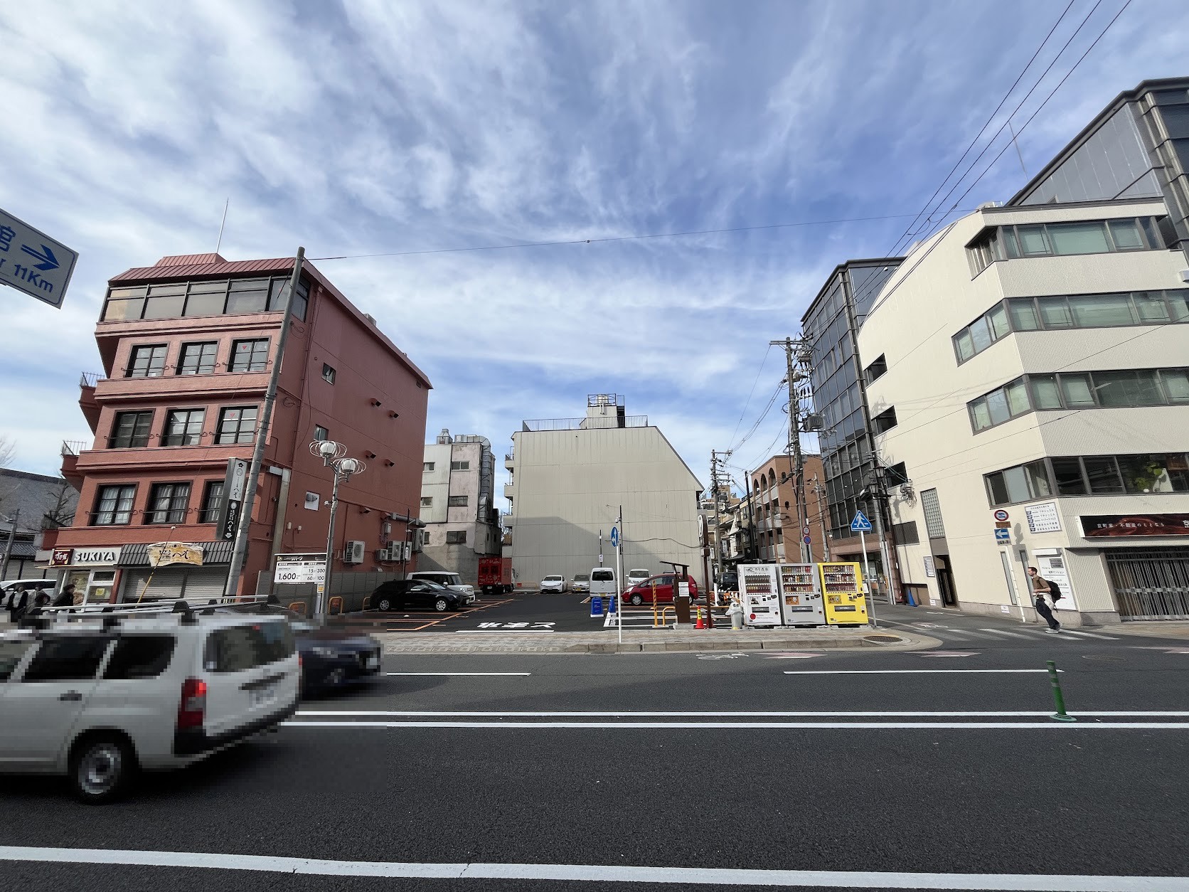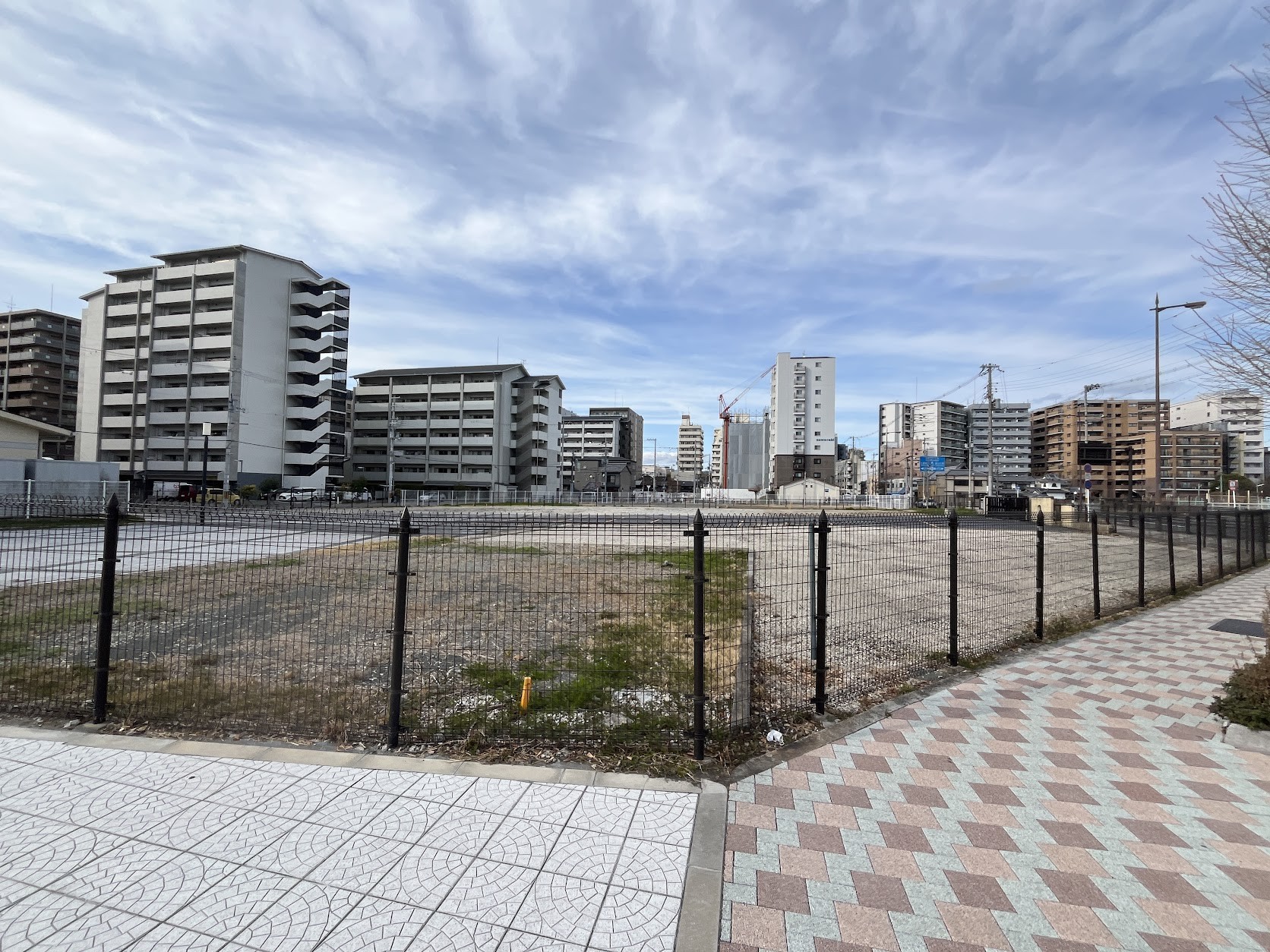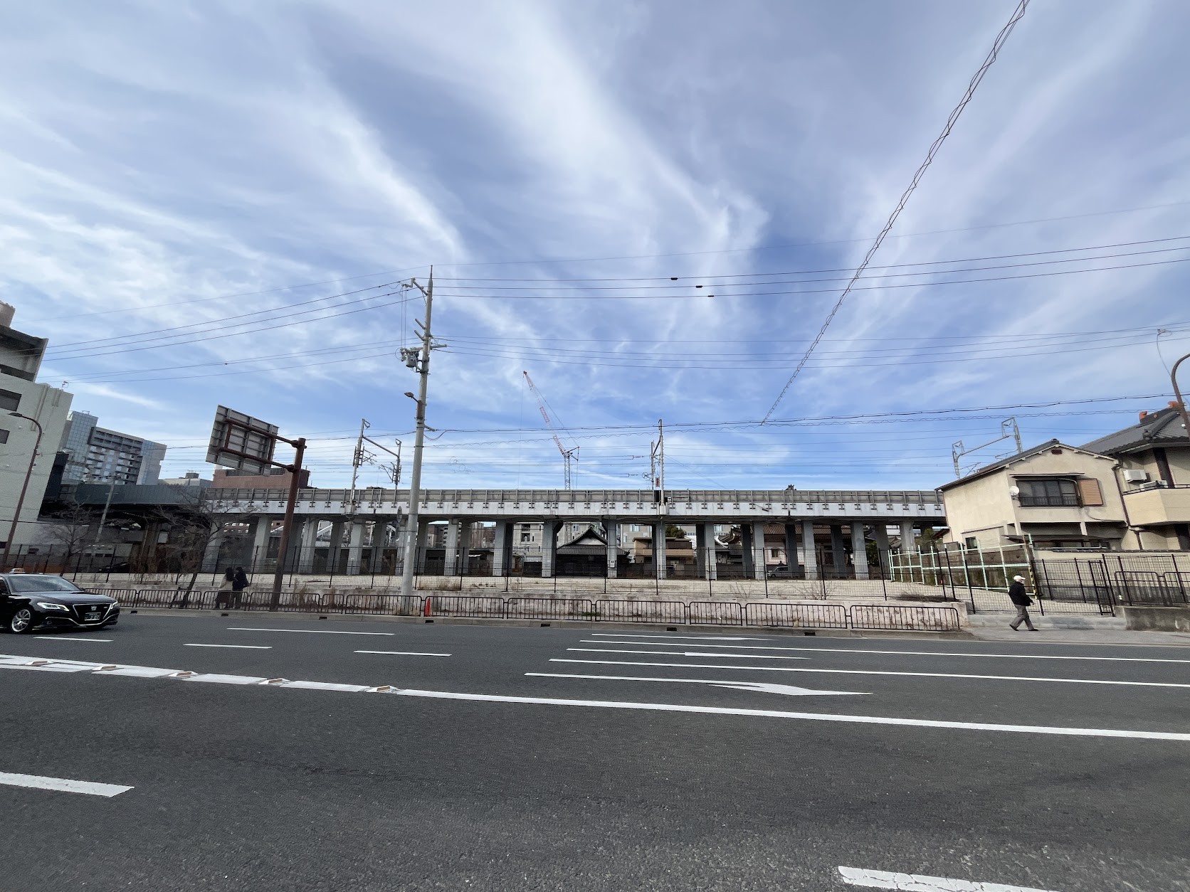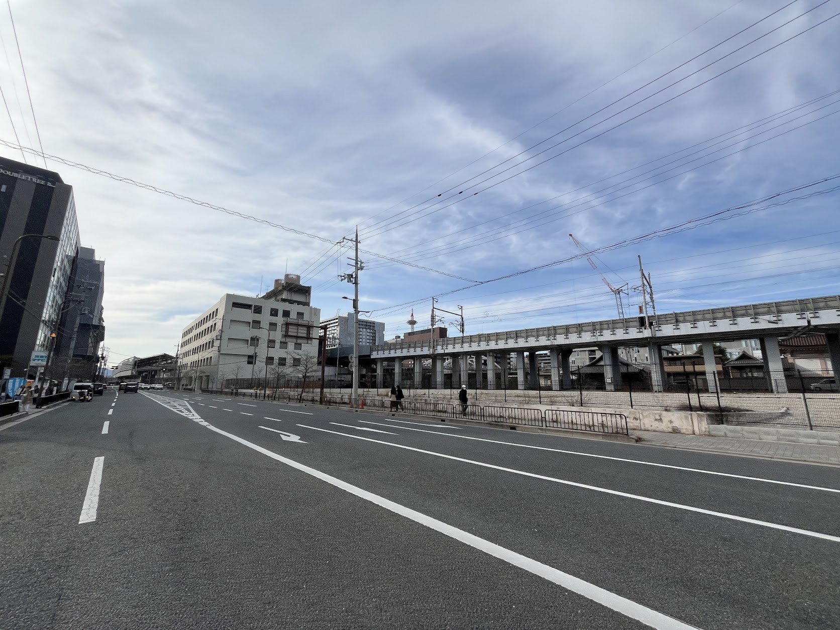 ホテルストリートの八条通。崇仁市営住宅8棟跡地の更地にはJR東海グループらによる2028年開業予定の複合ビル計画「(仮称)京都駅東部複合型拠点整備プロジェクト」 が予定されています