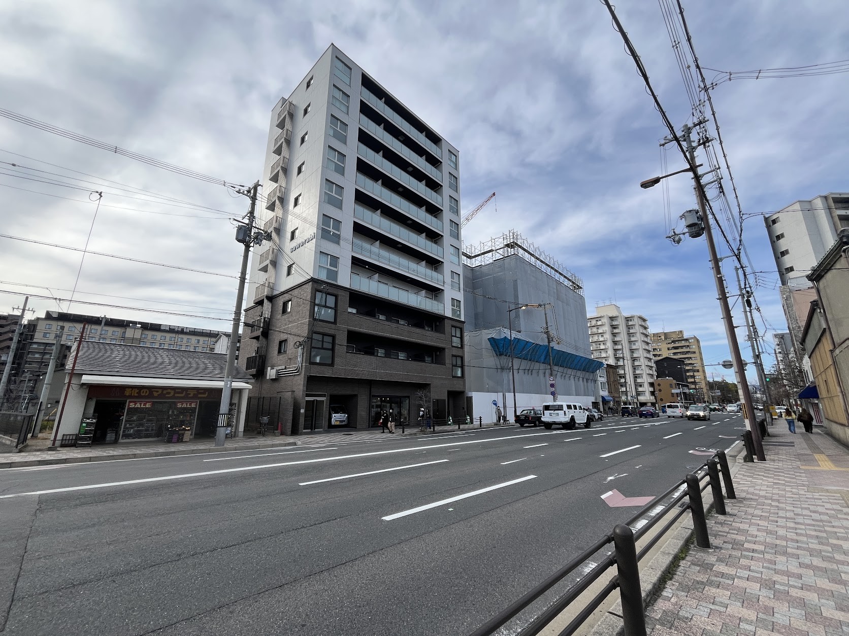 河原町通沿いには昭和の匂いを残したままの「靴のマウンテン」。その北に建設中の賃貸マンションの一階には京都駅周辺で切望されていたスーパーが入居との事です